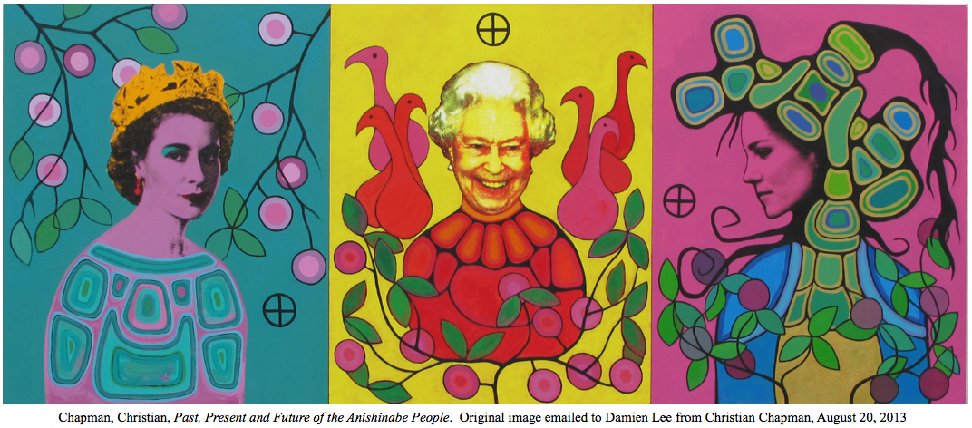 Christian Chapman’s Past, Present and Future questions the normalization of race-based belonging in ways that draw together our treaty relationship with the Crown while also asserting the contemporary validity of Anishinaabeg legal order of discerning belonging.  The images of Queen Elizabeth as a young queen (the past), then again as an older Queen (the present), are juxtaposed with an image of Kate Middleton, the Duchess of Cambridge – most likely a future Queen.  The women in the three images are re-dressed in Anishinaabeg aesthetic; in each image we see a spirit circle, an element common to Anishinaabeg ‘woodlands’ art symbolizing our connection to the ecology-spirit world.