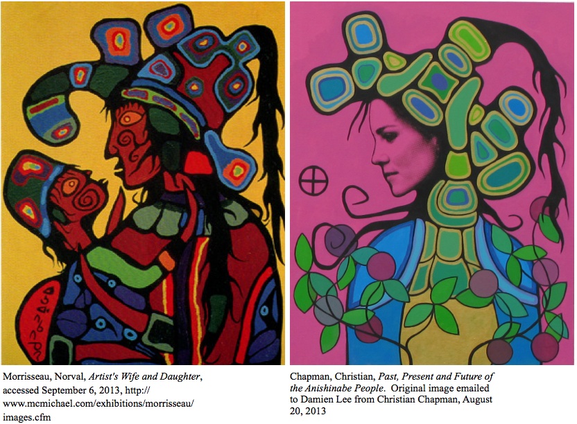 [16] Seen together, Morrisseau’s Self-Portrait and Artist’s Wife and Daughter speak to re-creating the Anishinaabeg through family-making.  See Morrisseau’s Self-Portrait here: http://www.mcmichael.com/exhibitions/morrisseau/images.cfm
